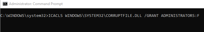 Once finished, give administrators access to the corrupt file. Do so by typing the following command: ICACLS/GRANT ADMINISTRATORS:F