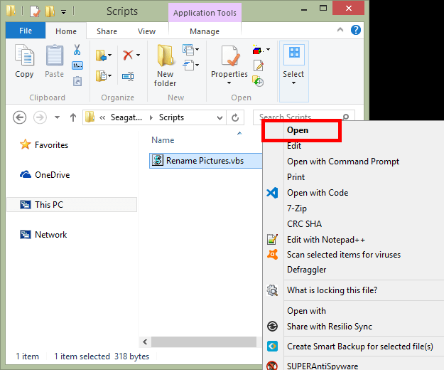 That’s it! To edit the VBS file to change the location of the files to rename, or to adjust what to replace in the files, just right-click the VBS file like you see above, but instead of opening it, choose** Edit**.