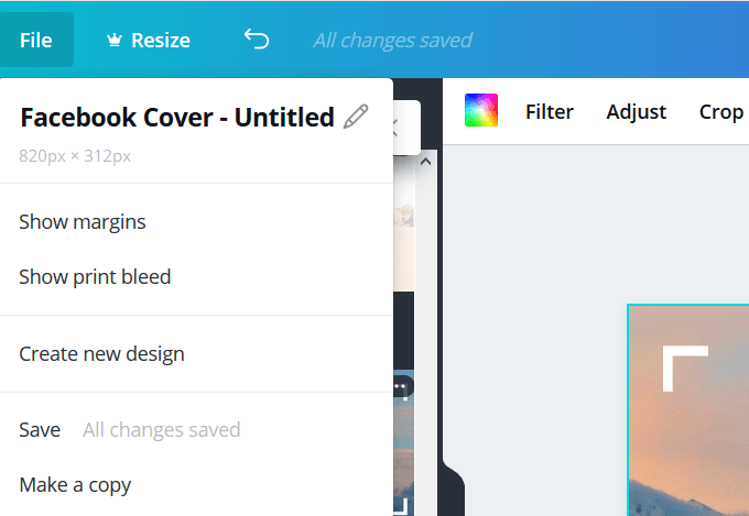 Once you have chosen your design type, Canva takes you into its editor. We will use a Facebook Cover for this tutorial. If you want to get started quickly, you can use one of the many templates provided by Canva.