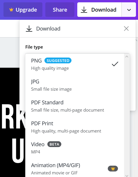 Save your image to your computer by clicking Download in the top right-hand corner. You will see several formats to choose from in the dropdown menu.