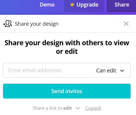 Once your design is ready, invite others to view or edit. Send an email invitation by entering an email address or copy the link to share.