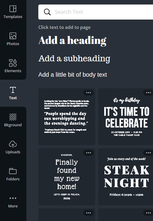 Use the text tab to add a heading, a sub-heading or a body of text. You can also add a text combination which are different fonts put together in a visually appealing way.