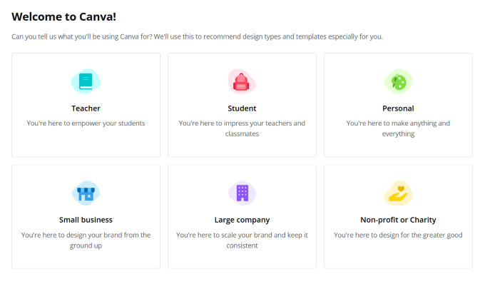 You are asked to choose an option to help Canva know which templates and design types to recommend to you. However, because you are signing up for a free account, it doesn’t matter which option you choose.