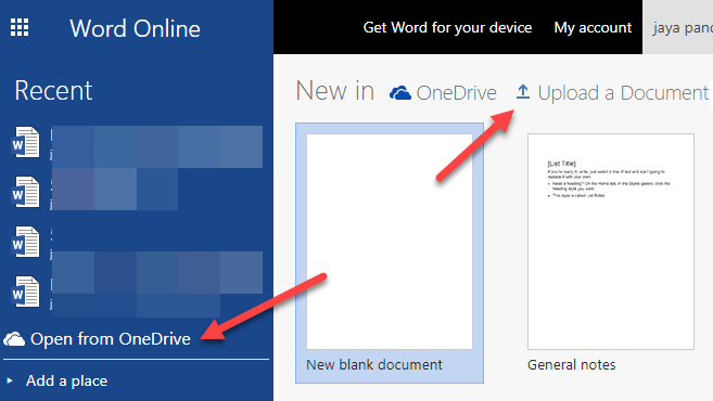 For the core apps, you can create new files, which will automatically be stored in your OneDrive folder or you can upload new documents from your local computer.