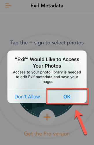 - Download and install Exif Metadata for your iOS device. Once installed, open the app and give it permission to view your photos by pressing OK.
