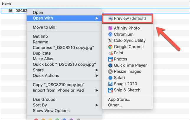 - To view the full EXIF metadata for an image file, you’ll need to use the **Preview** app. Right-click the image and press **Open With > Preview** to begin using it.