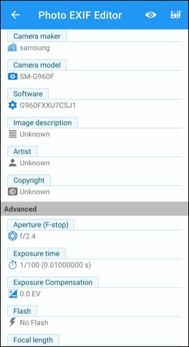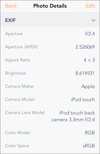 - When you select a file to view in the Photo Exif Editor app, the EXIF metadata for that file will appear. Scroll through the list to view a full set of data, including the camera model, exposure and color balance settings, image resolution, and more.