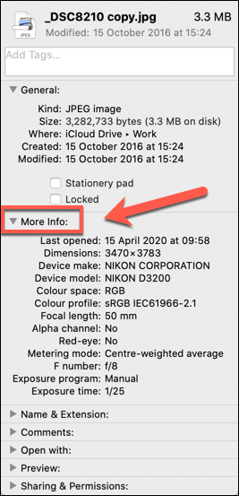 - This brings up the **Info** window for a file, where you can view basic information about it. You may be able to view some EXIF data under the **More Info** tab—click on this category if it isn’t visible.