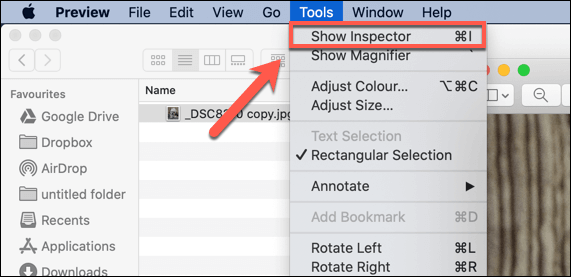 - Once Preview is open, press **Tools > Show Inspector** from the toolbar menu.