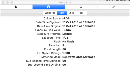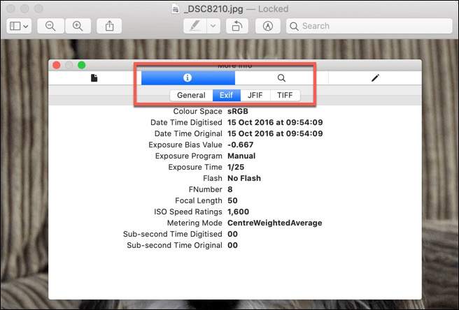 - In the **Inspector **window, press the **info****icon** (shaped like the letter **i**), then click on the **EXIF** tab to view the full EXIF metadata for your image file.