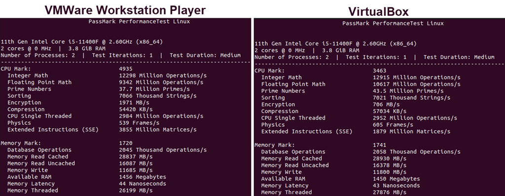 Both hypervisors are Type 2, running on top of Windows, so don’t expect a significant performance difference. Using PassMark PerformanceTest, VMWare Player showed a CPU Mark of 4935 versus VirtualBox’s 3465. That was the biggest difference. The rest of the markers were close, yet it felt like VMWare was faster. Of course, host machines vary, and so will your experience.