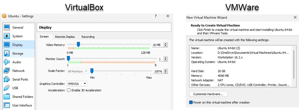 VirtualBox requires making some manual choices about resources like memory, drive space, and the number of processor cores, whereas VMWare Player compares your host computer’s resources to those required by the guest OS and automatically assigns resources, making it user-friendly. After the guest OS is installed, you can adjust the resources assigned in both hypervisors.