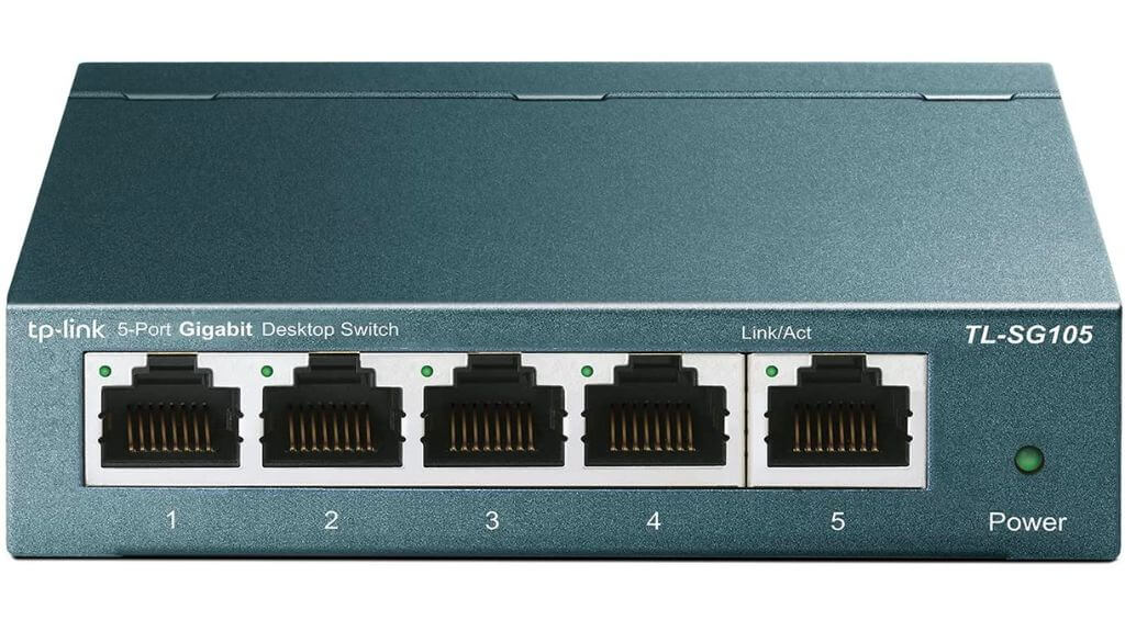 Take this TP-Link TL-SG105 5 Port Gigabit Ethernet Switch as an example. For less than $20, you can turn one gigabit Ethernet port outlet into five, which all efficiently share that total bandwidth. This small fanless Ethernet unmanaged switch is just as plug-and-play as an ethernet network splitter but without any compromises.