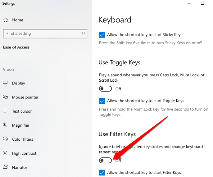 Filter Keys is an accessibility option in Windows 10 designed for people who find it hard to hold down multiple keys at a time. The feature adjusts the keyboard response and ignores repeated keystrokes caused by inaccurate or slow finger movements.