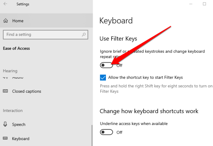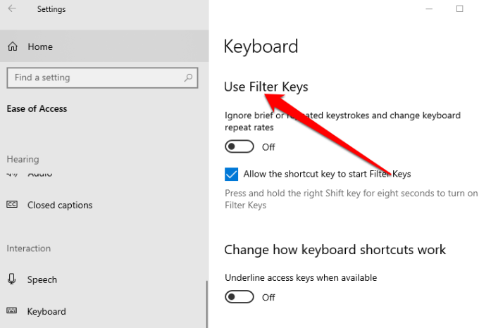 - Toggle the button next to the **Use Filter Keys **option to turn it off and exit the Settings app.