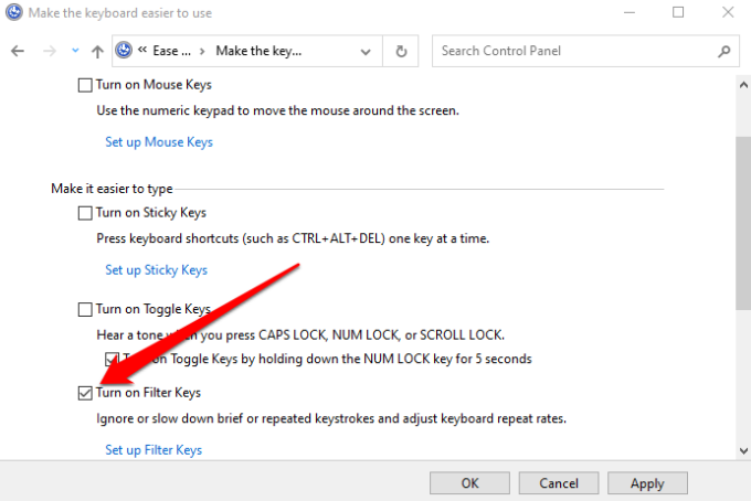 - Deselect the box next to **Turn on filter keys** to disable the Filter Keys feature and select **Apply**.