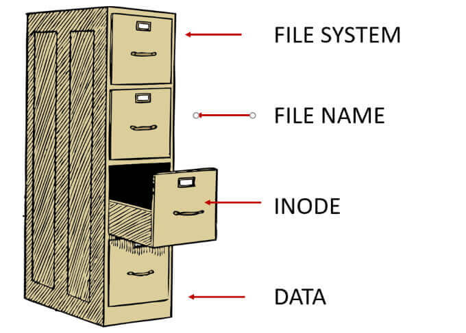 The top part of the hierarchy is the file system itself. Within the file system are the file names. The file names link to the inodes. The inodes link to the physical data.