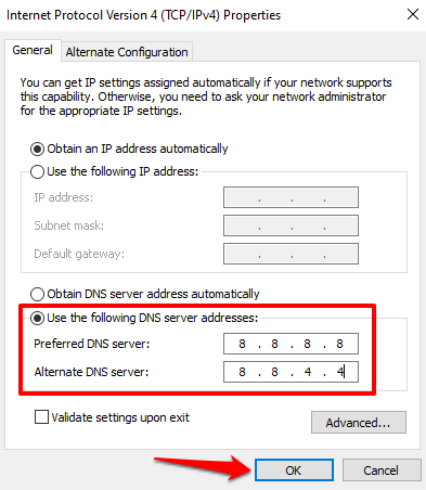 - Check the “Use the following DNS server addresses,” enter 8.8.8.8 in the Preferred DNS server box and 8.8.4.4 in the Alternate DNS server box. Click OK to proceed.