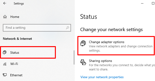 To change your DNS provider on Windows, go to Settings >** Network & Internet** >** Status** and click Change adapter options.