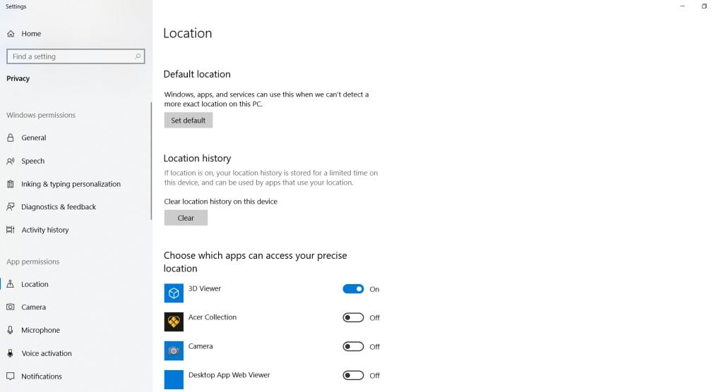- The next option is to clear your location history. When this is on, your location gets stored on your PC for a limited time. However, you can use the **Clear** button to clear your location history instantly.