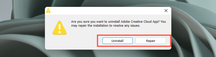 - Select Repair. If that does not help, select Uninstall and then download and reinstall the latest version of Creative Cloud Desktop.