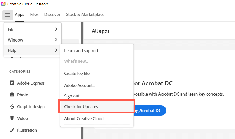 - Point to Help and select Check for Updates. If there are new updates, the Creative Cloud Desktop app should automatically install them.
