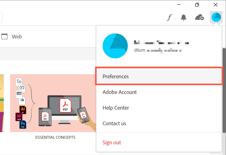 - Select your Adobe account’s profile icon on the top right of the window.