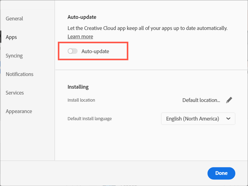 If Creative Cloud Desktop is set to update itself or the Adobe apps on your computer automatically, the Adobe CEF Helper process could get stuck checking for newer software versions and consequently use a lot of CPU. Disable automatic updates to fix that: