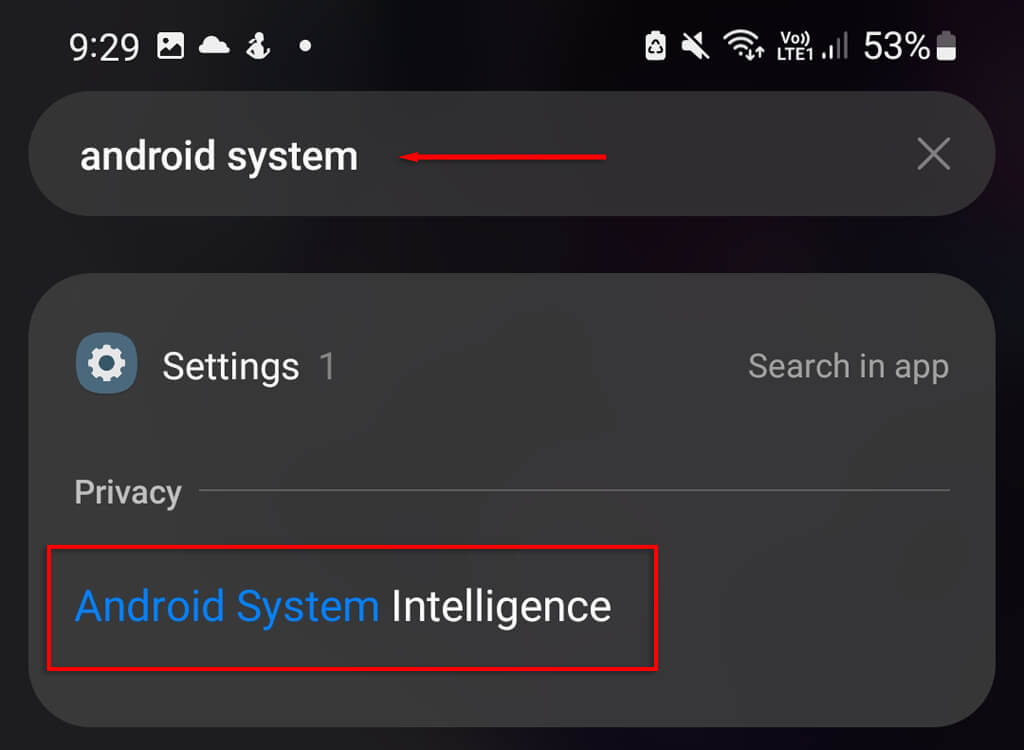 - Open your phone’s search bar and type “Android System Intelligence.”