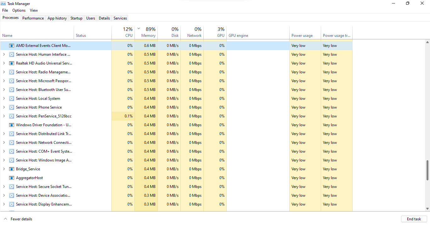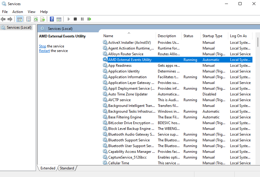 - The app lists all services on your computer, whether active or not. As the list is alphabetical, you will find the AMD External Events Utility near the top.