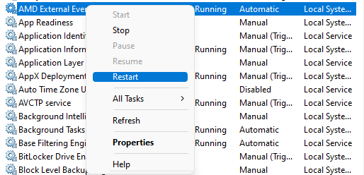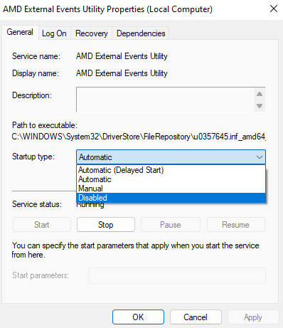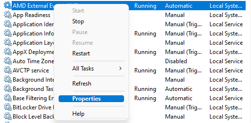 - Otherwise, right-click on AMD External Events Utility and select Properties.