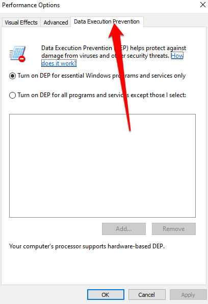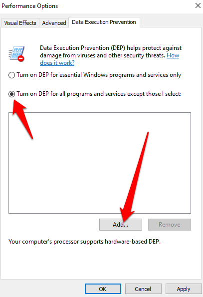 - You can also add exceptions to DEP if needed, but do this only if there are no other alternatives. To add exceptions, select **Turn on DEP for all programs and services except those I select** and then select **Add. **Choose the executable file you want excluded, and then restart your PC for the changes to take effect.