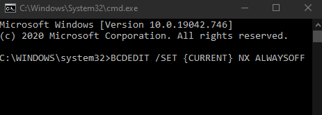 - In the Command Prompt window, enter this command: **BCDEDIT /SET {CURRENT} NX ALWAYSOFF **and press **Enter**. The change will take effect after your computer restarts. In some cases, you may need to adjust a BIOS setting to disable DEP via this command.