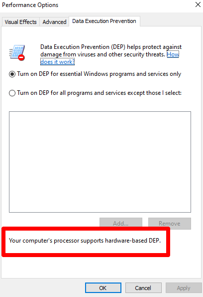 Types of Data Execution Prevention in Windows 10