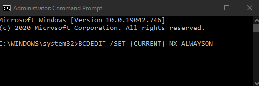 - To enable DEP again, open an elevated command prompt and enter this command: BCDEDIT /SET {CURRENT} NX ALWAYSON. Restart your PC for the changes to take effect.