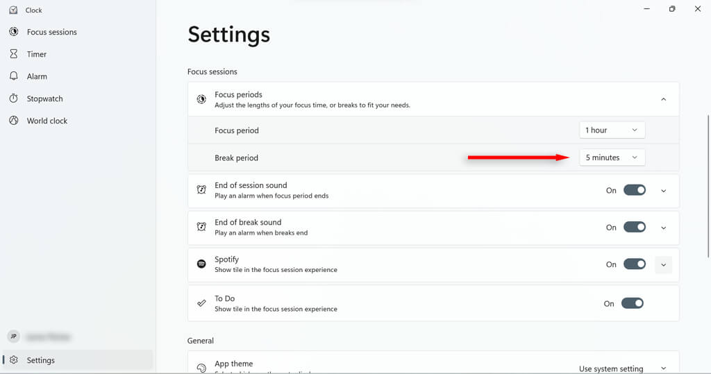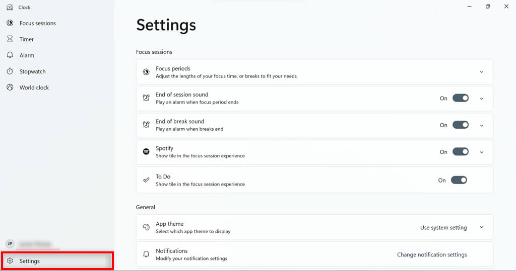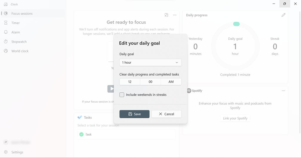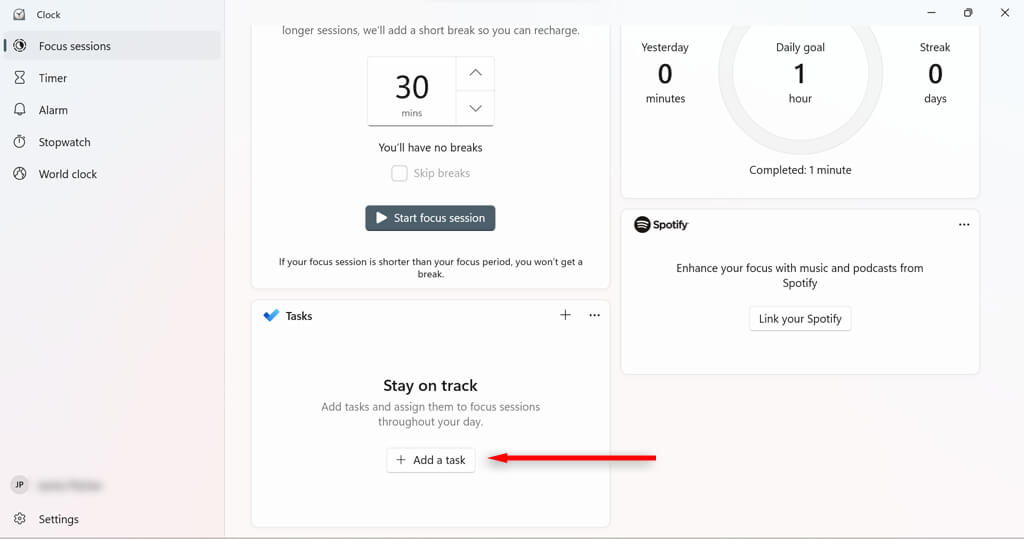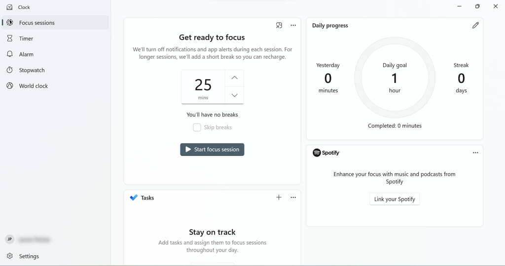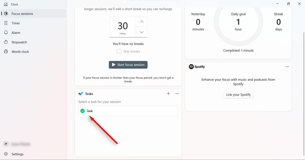 Focus assist has some features that you can configure to optimize your session. For example, you can add breaks to your session, add tasks, link your Spotify account, set daily goals, and change to alarm sound for the end of your sessions.