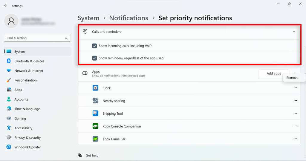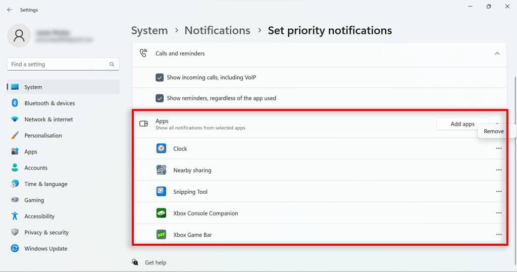- Under the Apps section, you can determine which specific apps can push notifications when you are using Do Not Disturb. To add an app, press the Add apps button and select the app. To remove an app, click the three dots next to the listed app and select Remove.