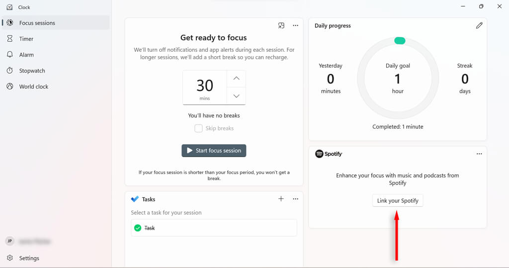 There are tiles that let you link your Spotify account (should you have one) to your focus sessions or use Microsoft To Do to pick a task for that session.
