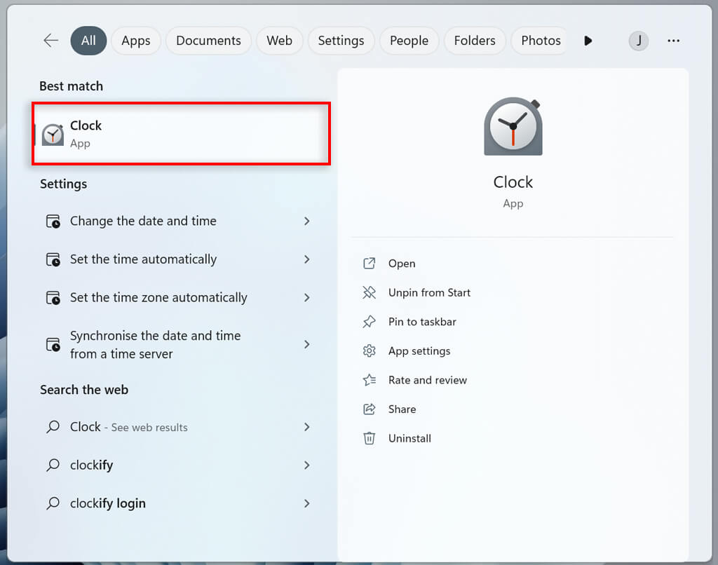 - Type Clock into your taskbar search bar. Select the Clock app to open it.