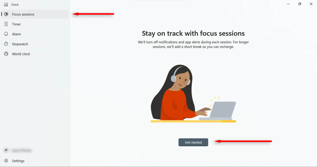 - In the menu on the left-hand side, navigate to Focus sessions. * Select Get Started.