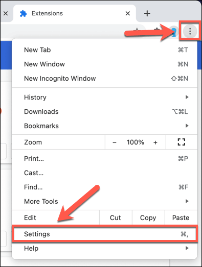 - To begin, open a Chrome browser window and select the **three-dot menu icon **in the top-right. From there, select the Settings option.