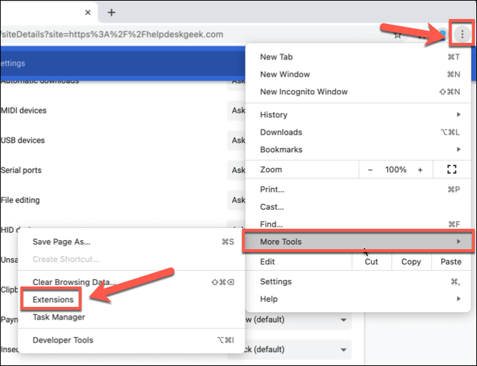 - To disable Chrome extensions, select the three-dot menu icon in the top-right, then select More Tools > Extensions.