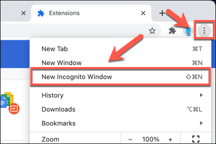 - To switch to incognito mode, select the three-dots menu icon in the top-right, then select the **New Incognito Window **option.