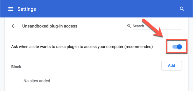 - To disable the Google Chrome Helper, select the slider at the top of the menu to the **off **position. When this is turned off, the option will update to **Do not allow any site to use a plugin to access your computer**, rather than **Ask when a site wants to use a plug-in to access your computer (recommended**).