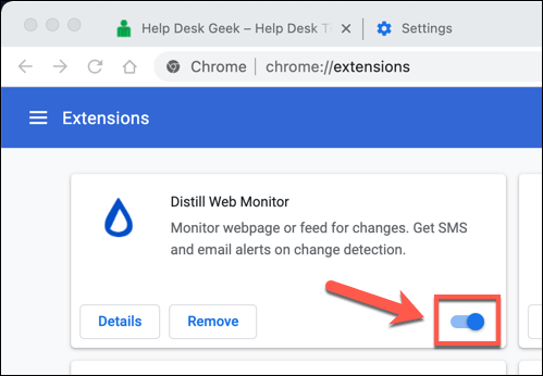 - In the Chrome extensions menu, select the slider next to an extension to disable it, placing it in the **off** position.