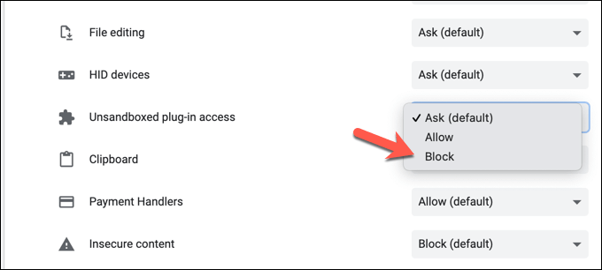 - In the site permissions menu, you can block third-party plugins by setting **Unsandboxed plug-in access** to **Block**.
