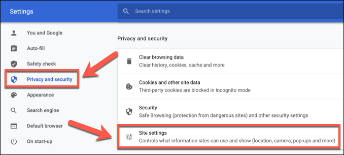 - In the left-hand options panel in the Chrome settings menu, select **Privacy and security**. On the right, select the **Site Settings** option.