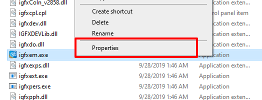- Right-click on **igfxem.exe** and select **Properties** from the context menu.