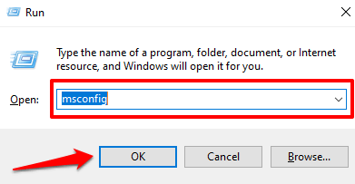 - Launch the Windows Run box (Windows key + R). Type msconfig into the dialog box and click OK.
