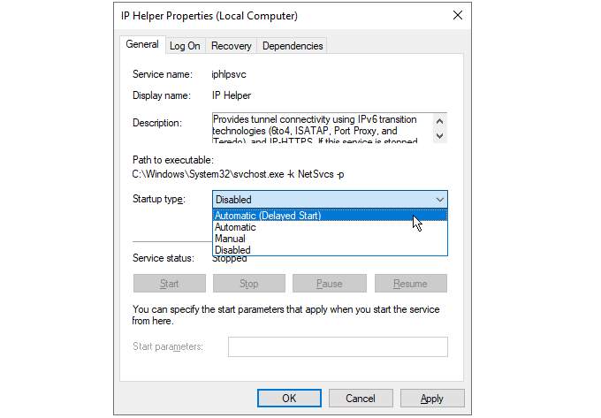 Next time you reboot your computer, the service will resume. If you want to speed up your computer’s boot time, you can select **Automatic (delayed start)** from the same list. This will delay starting the IP Helper process for 1-2 minutes at startup, giving your computer less to do in the initial boot.